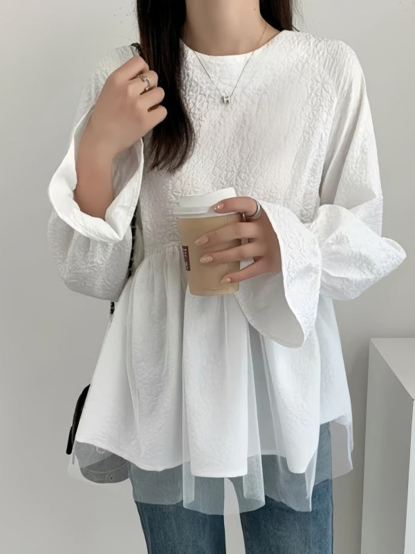 A-Line Flared Sleeves Elasticity Mesh Solid Color Split-Joint Round-Neck Blouses&Shirts Tops