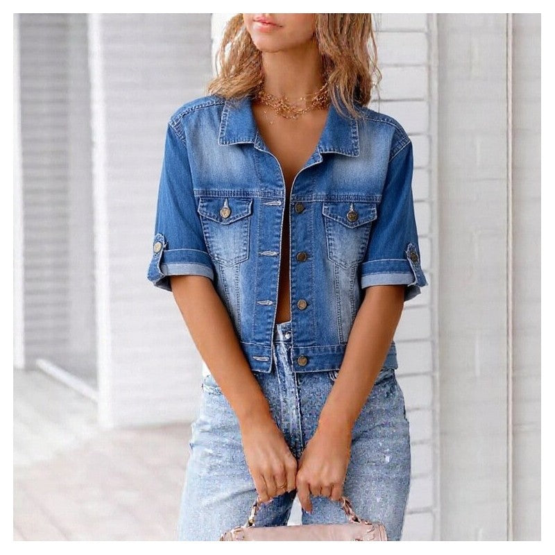 Solid Color Lapel Seven Quarter Sleeve Denim Jacket Jacket