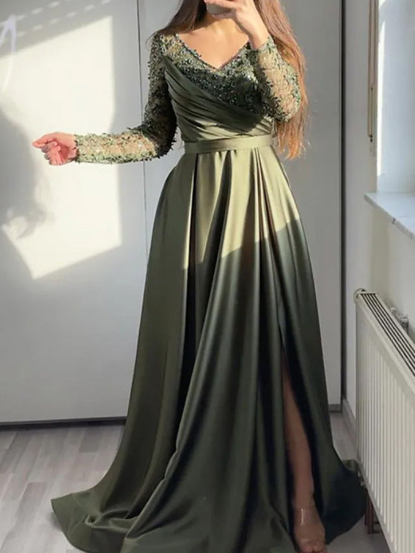 Temperament Lace Ruffled Sequined Long Sleeves Evening Maxi Dresses