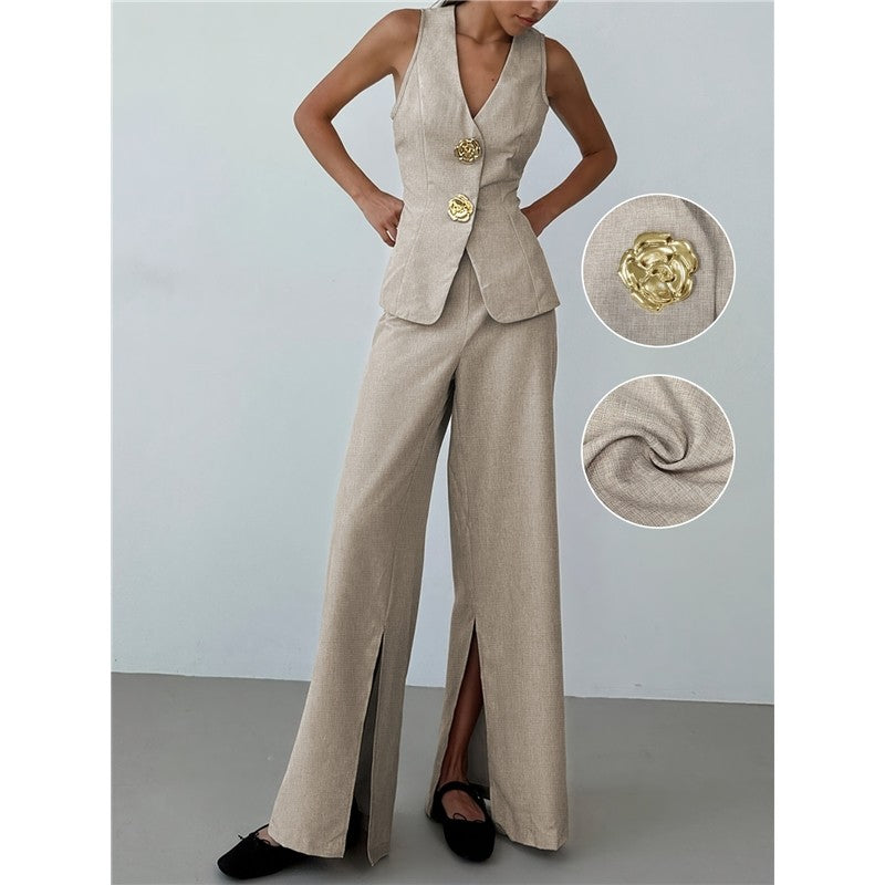 Breathable V-Neck Sleeveless Vest Slit Wide-Leg Pants