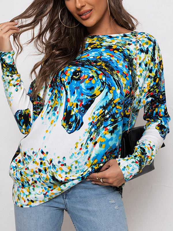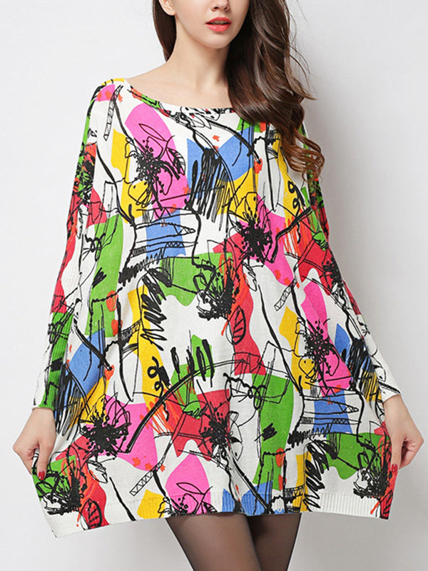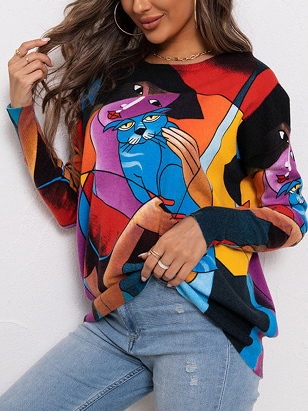 Long Sleeves Loose Printed Split-Joint Round-Neck Sweater Tops