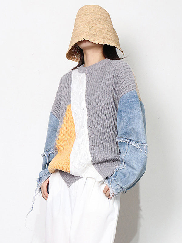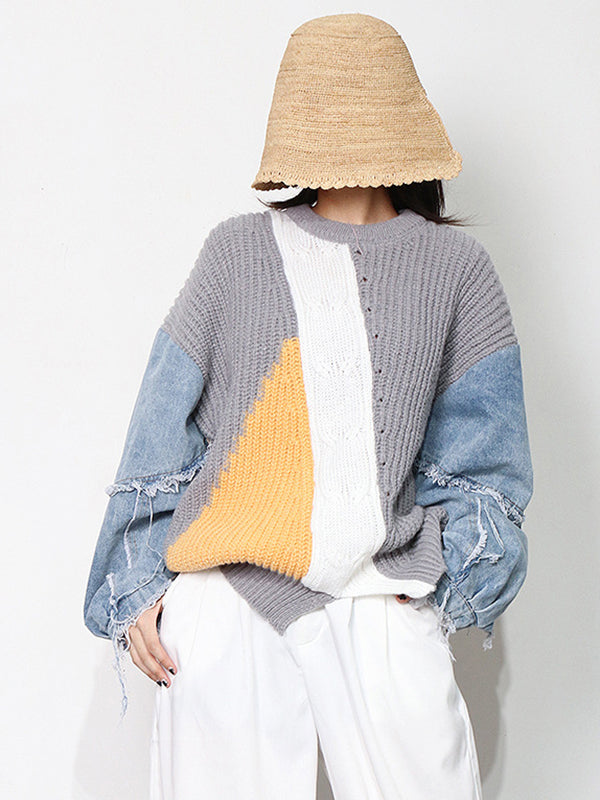 Stylish Denim Knitting Split-Joint Contrast Color Sweater Top