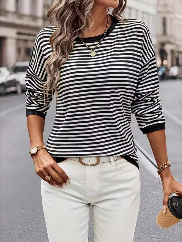 Long Sleeves Loose Contrast Color Split-Joint Striped Round-Neck Pullovers Sweater Tops