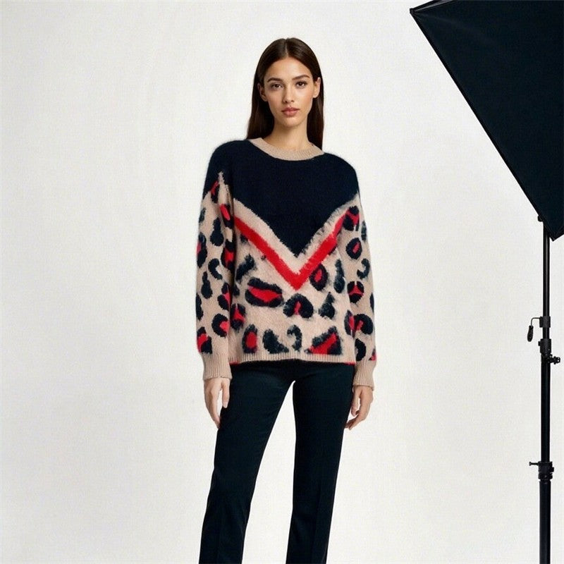 Long Sleeves Loose Animal Printed Round-Neck Knitwear Pullovers Sweater Tops