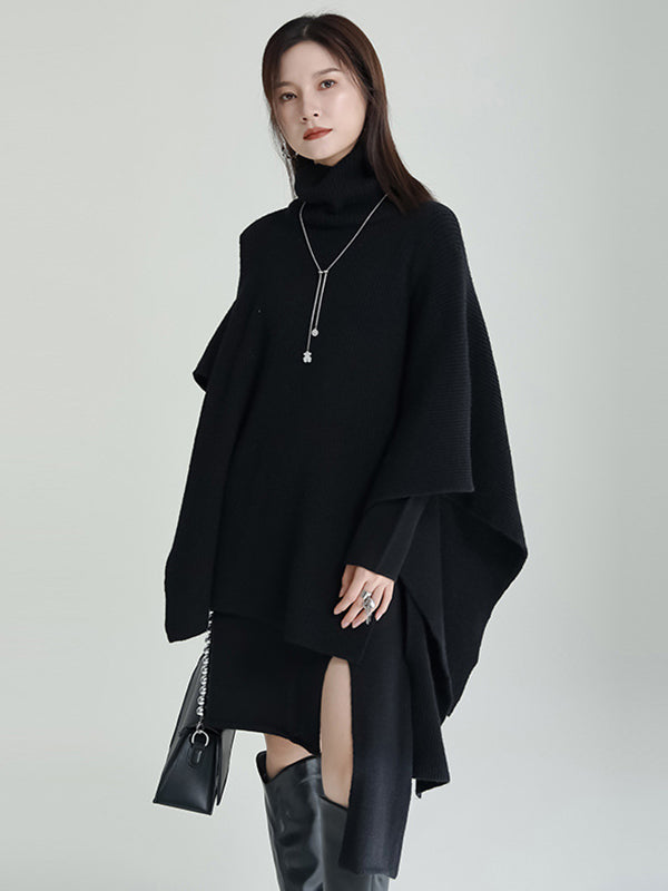 Casual Long Sleeves Loose Solid Color High-Neck Shawl&Sweater Dresses Two Pieces Set