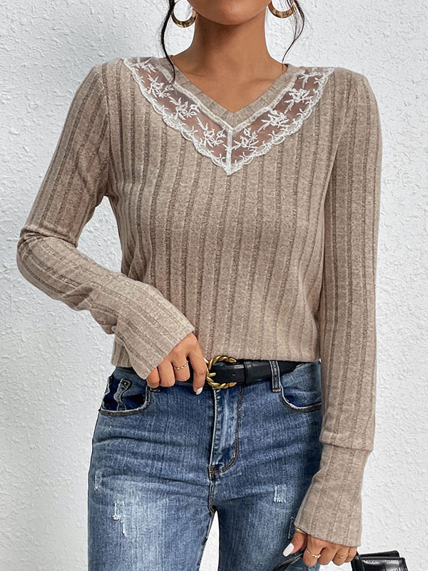 Material:95% Polyester,5%Spandex,LaceStyle:Long Sleeve,SkinnyFeature:Split-JointNeckline:V-neckOccasion:Casual,Urban,SexySeasons:Spring,AutumnType:T-Shirts TopsSize S (inch) : Bust= 35.88 ; Shoulder= 15.02 ; Sleeve= 23.40...