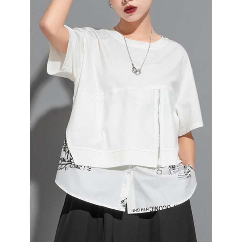 False Two Loose Printing Split-Joint Round-Neck T-Shirts Tops