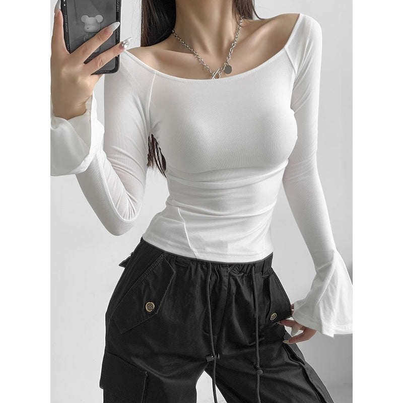 Material:SpandexStyle:Flared Sleeves,Long Sleeve,SkinnyFeature:Pleated,Solid ColorNeckline:Boat NeckOccasion:Sexy,Leisure FashionSeasons:Spring,AutumnType:T-Shirts TopsSize S (inch) : Bust= 24.96 ; Shoulder= 10.53...