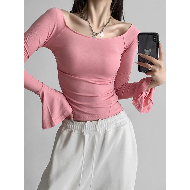 Flared Sleeves Long Sleeves Pleated Solid Color Boat Neck T-Shirts Tops