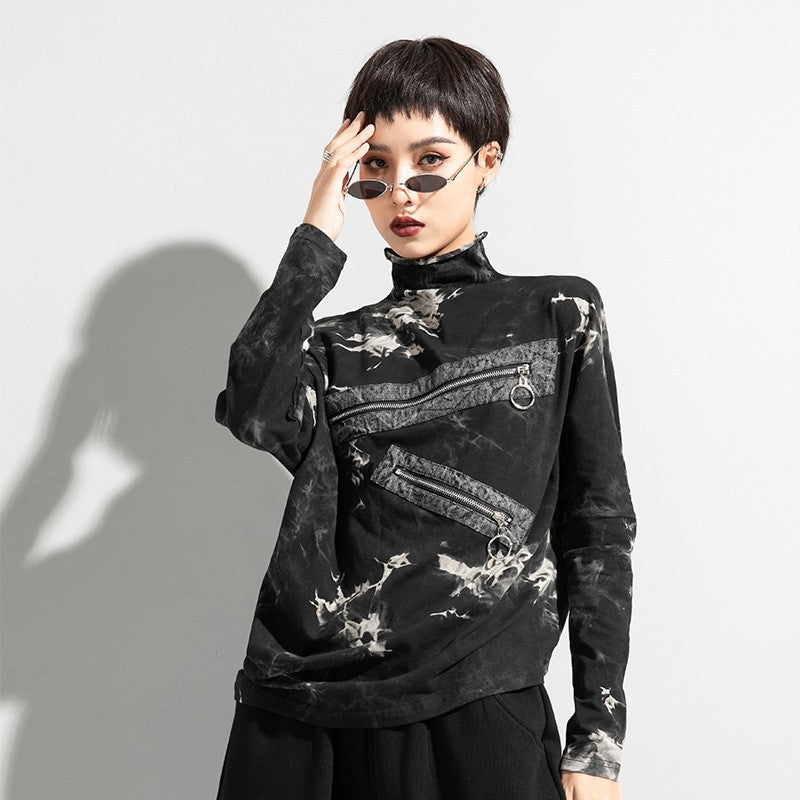 Material:CottonStyle:Loose,Intellectual,All-matchFeature:Graffiti Printed,Asymmetric,ZipperNeckline:Half TurtleneckOccasion:Going out,Casual,Artistic Retro,Light Maturity,Leisure FashionSeasons:Spring,AutumnType:T-Shirts TopsSleeve Length:Long SleeveSleeve Style:Raglan SleeveSize M (inch) :...