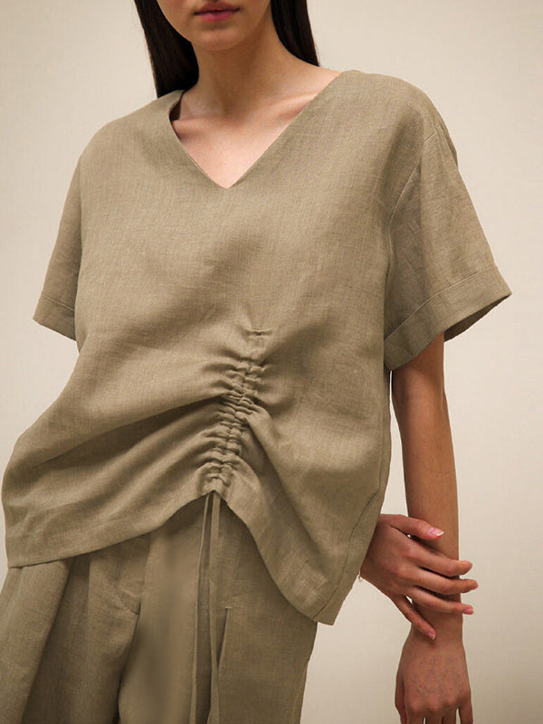 Loose Short Sleeves Drawstring Solid Color V-Neck T-Shirts