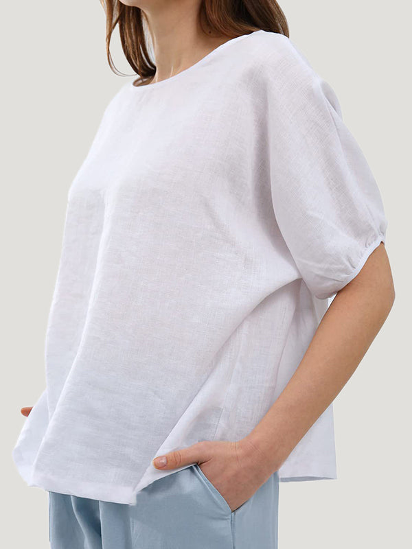 Material:>90%LinenStyle:Loose,Puff SleevesFeature:Hollow,Split-Joint,Solid ColorNeckline:Round-neckOccasion:Casual,Simple,VintageSeasons:SummerType:T-shirtsSize S (inch) : Bust= 49.92 ; Sleeve= 15.21 ; Length= 23.01 ;...
