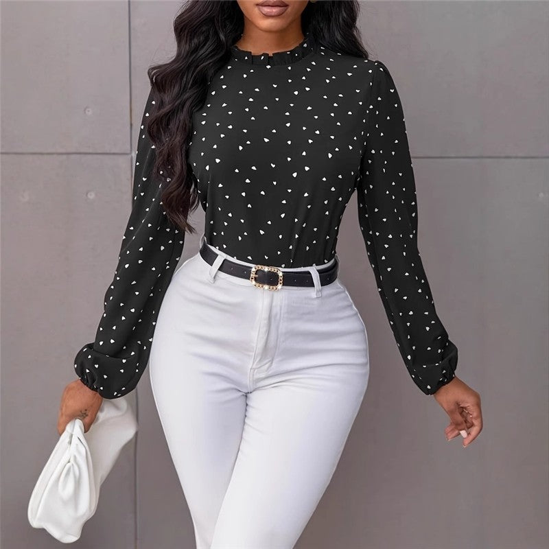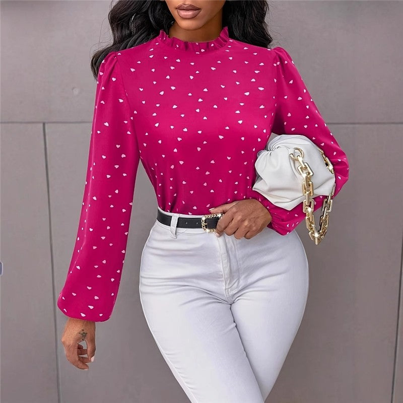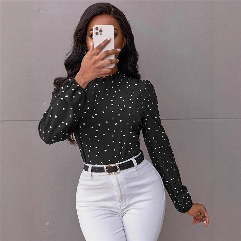 Material:DacronOccasion:Going out,Casual,Office,Artistic Retro,Girlish Sweetness,Light Maturity,Leisure FashionNeckline:Stand CollarSeasons:Spring,Summer,AutumnStyle:Loose,Cute,Intellectual,All-match,Look-youngerSleeve Length:Long SleeveType:BlousesSleeve Style:Bishop SleeveFeature:Heart PrintSize S (inch) :...