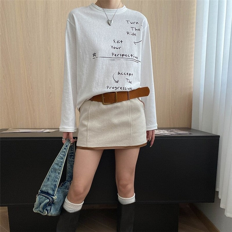 Simple Letter Print Round Neck Loose Long Sleeve T-Shirt