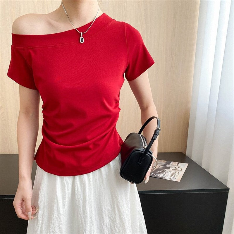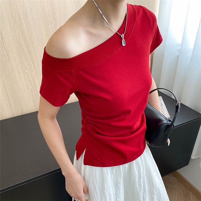Solid Color Asymmetrical Off Shoulder T Shirt