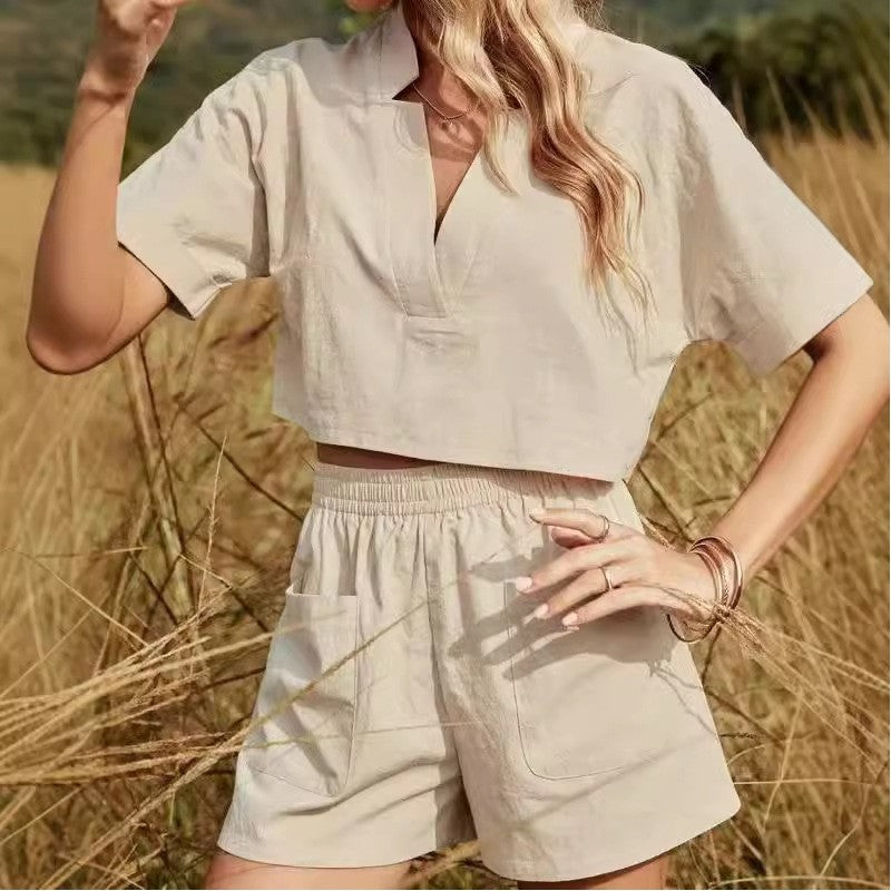 V Neck Solid Color Off Shoulder Top Shorts Set
