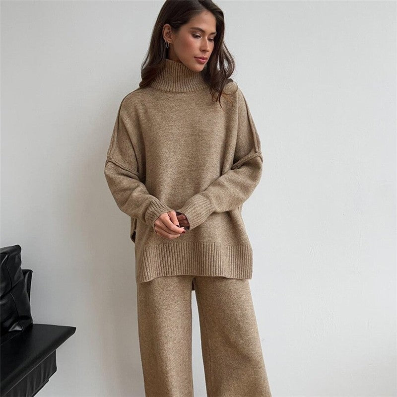 Solid Color High Neck Sweater Knit Long Pants Set