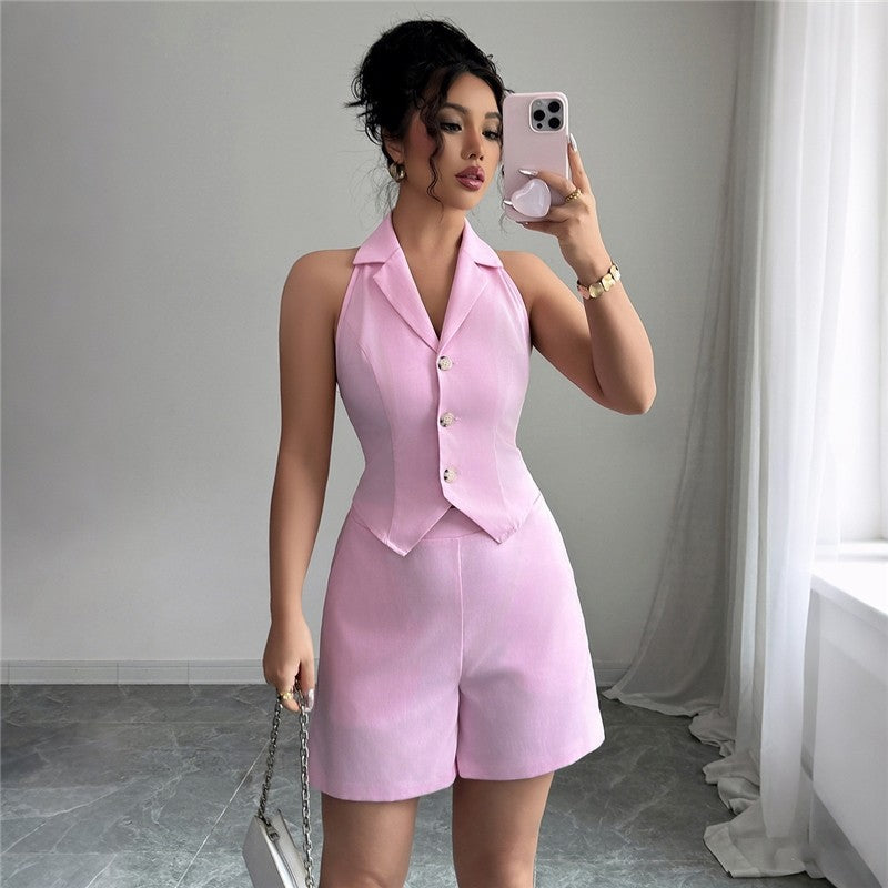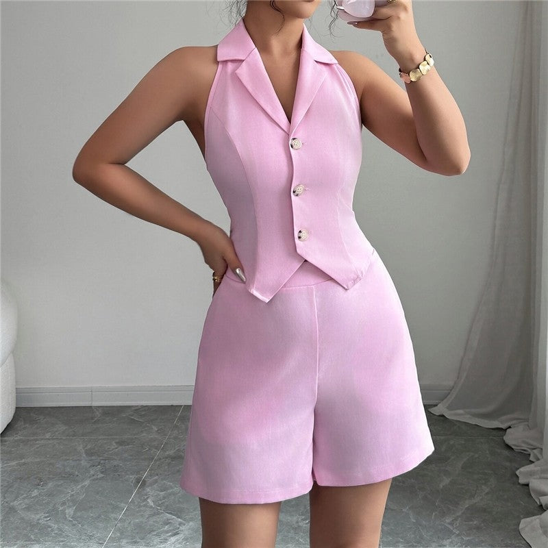 Pure Color Slim Button Vest Shorts Set