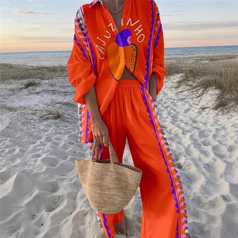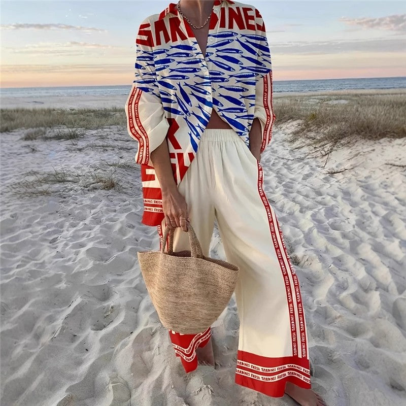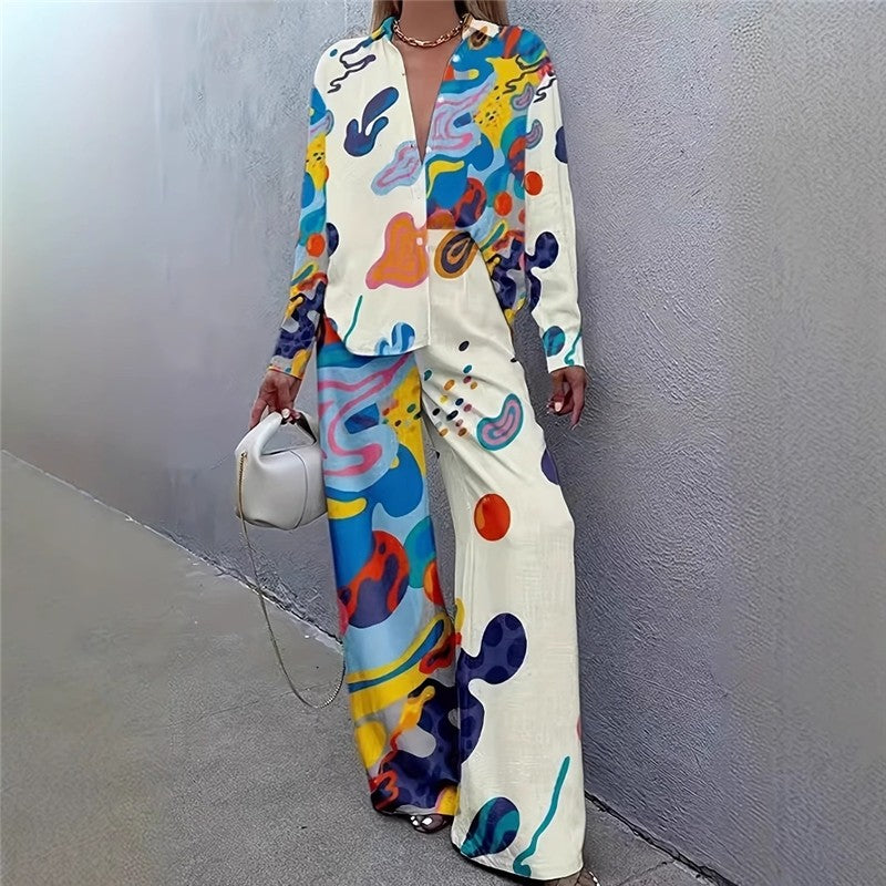 Casual Printed Long Sleeve Shirt Pants Set