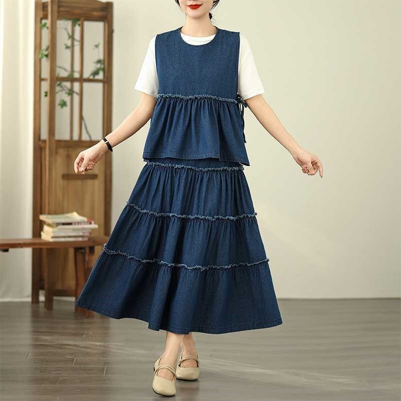 Sleeveless Denim Vest + Denim Patchwork Cake Skirt Set
