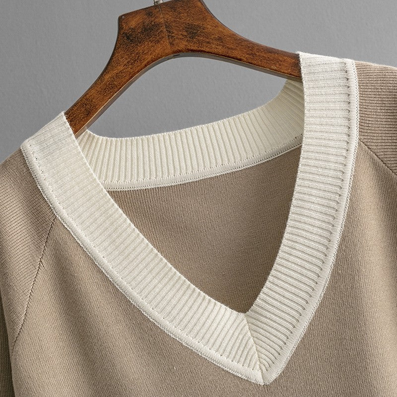 V Neck Color Block Knit Sweater Pants Set