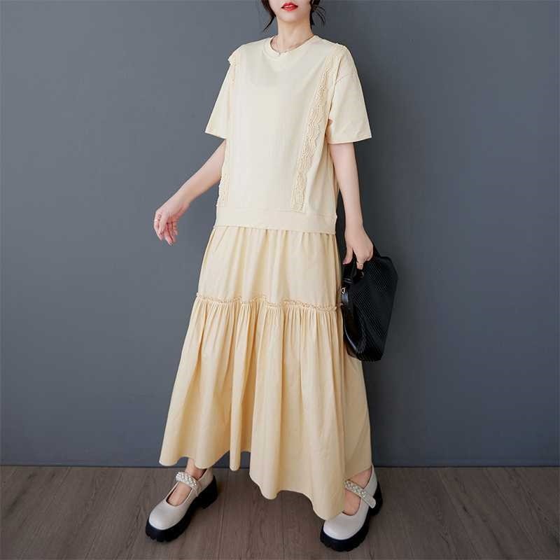 Material:Dacron,CottonOccasion:Going out,Casual,Artistic Retro,Girlish Sweetness,Light Maturity,Leisure FashionNeckline:Round-neckSeasons:SummerFeature:Paneled,Lace,PleatsStyle:Cute,Intellectual,All-match,Look-younger,Fake Two-PieceSleeve Style:Raglan SleeveType:Long DressesSleeve Length:1/4 SleeveSize One_size (inch) :...