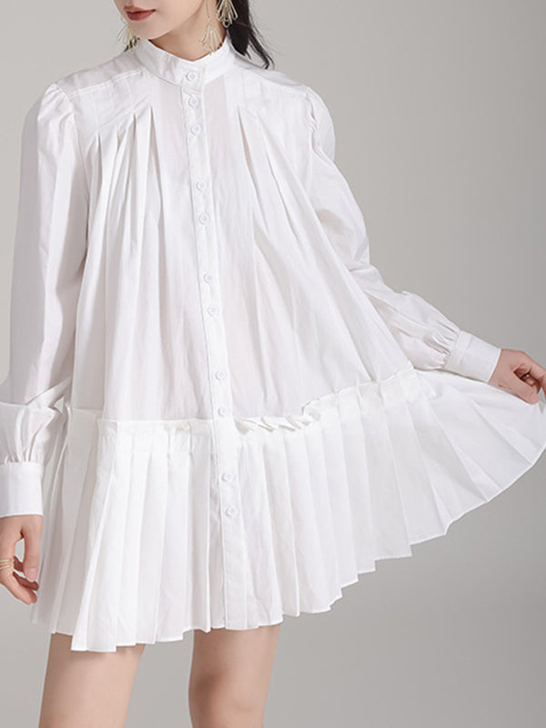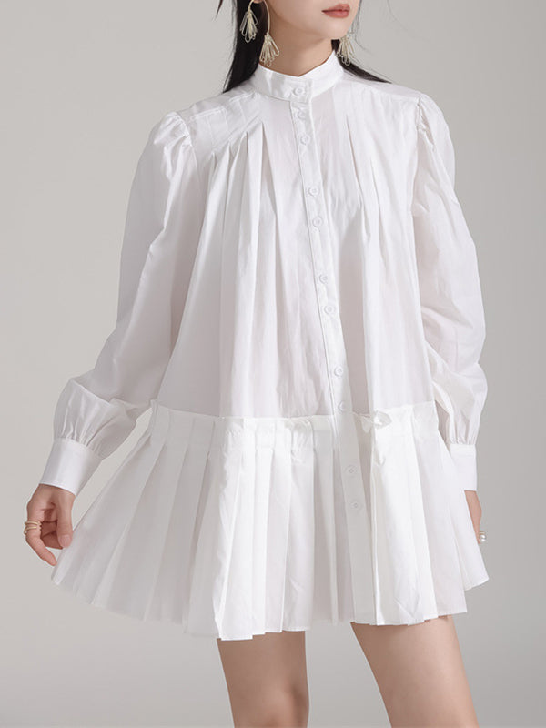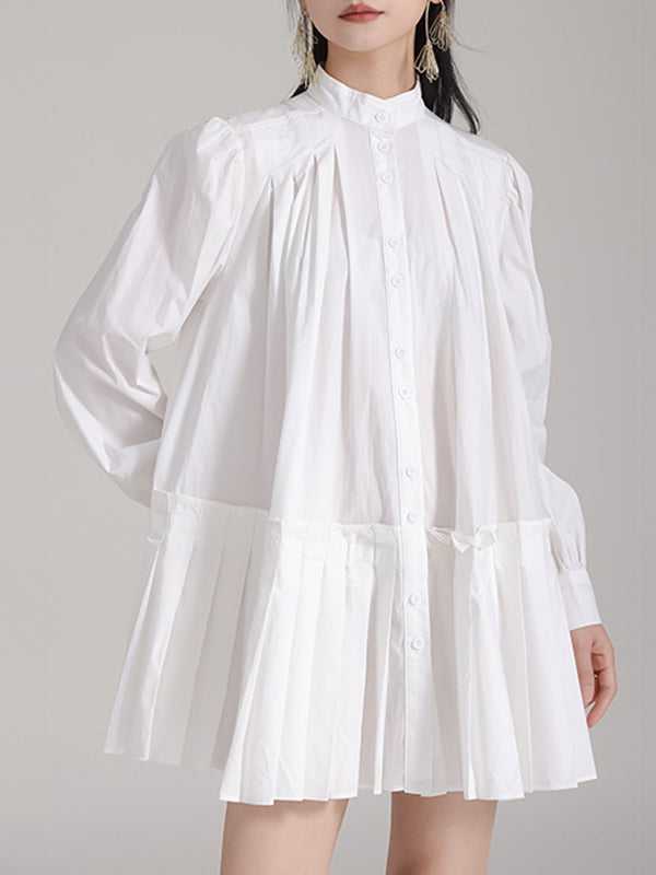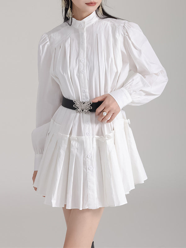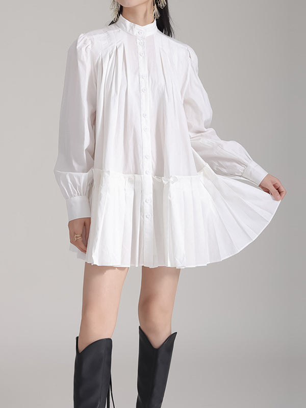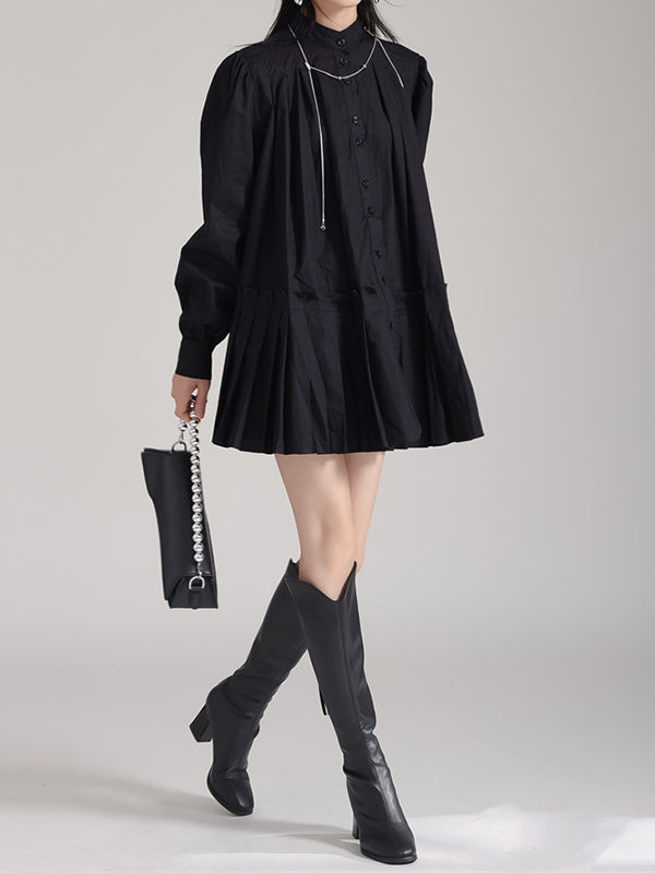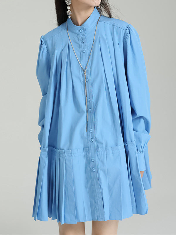A-Line Long Sleeves Buttoned Pleated Solid Color Stand Collar Mini Dresses