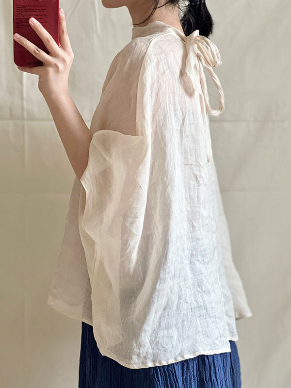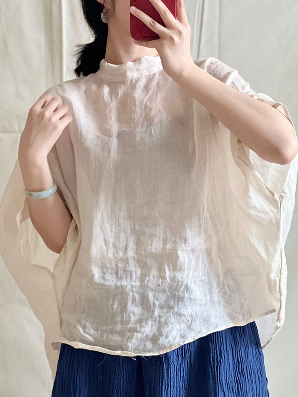 Batwing Sleeves Loose Lace-Up See-Through Solid Color Stand Collar Shirts Tops