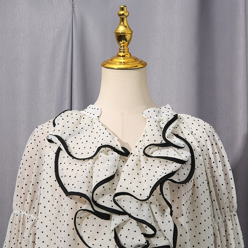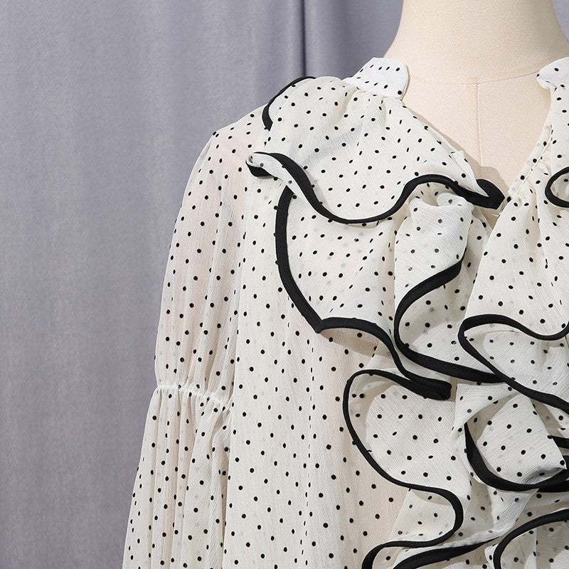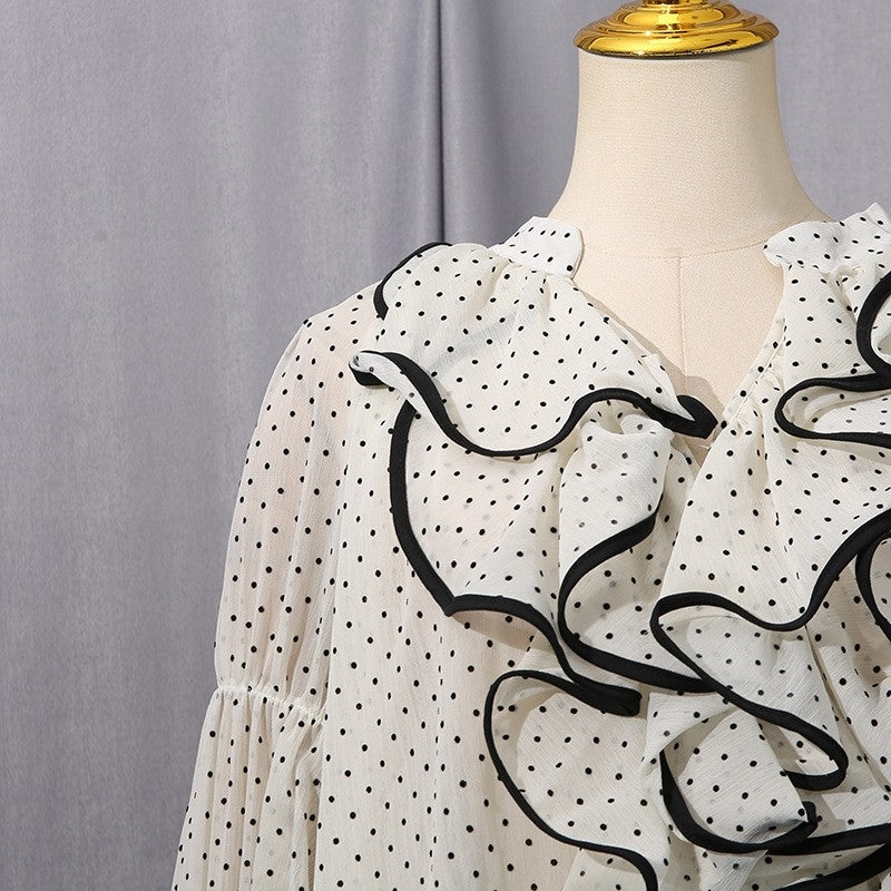 This top adopts a pullover style, with a regular length (50cm < length β€ 65cm), and the placket is designed as a pullover. The fabric is mainly polyester (polyester fiber), with a content ranging from 70% (inclusive) to 80% (exclusive), and also contains less than 30% spandex. The craftsmanship is patchwork/splicing. It has a loose fit, a V - neck, and flared long sleeves. Both the pattern and popular element are polka dots, and the color is white. The style is fresh and sweet, and it is suitable to be used as a women's shirt, a beautiful French top, an elegant chiffon shirt, a women's chiffon top, etc.