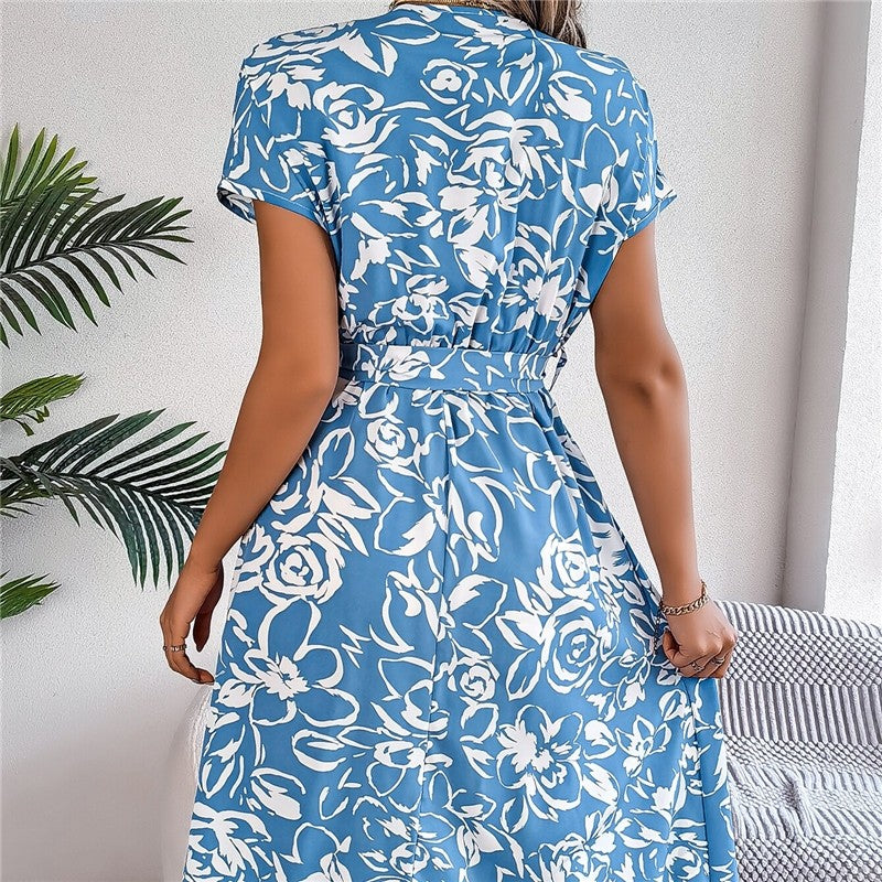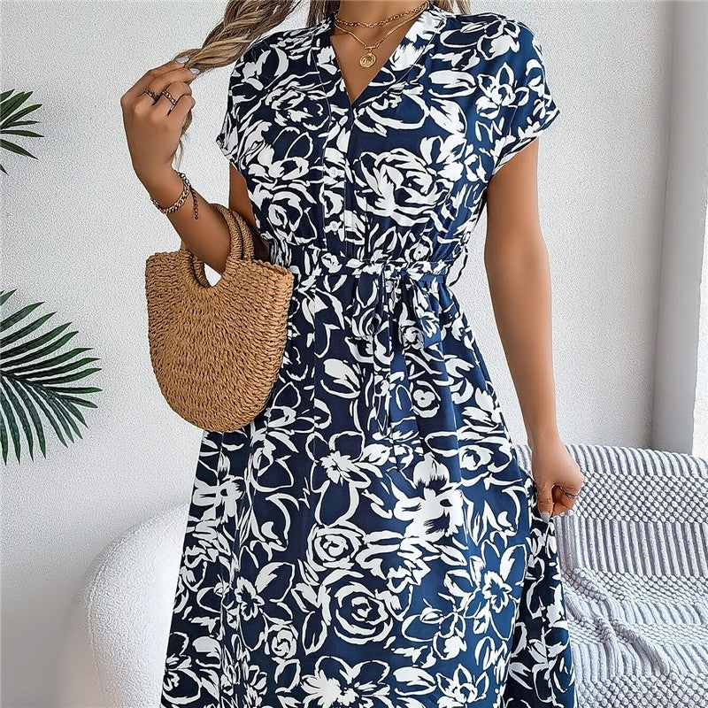 Casual V-Neck Button Batwing Sleeve Printed Swing Dress