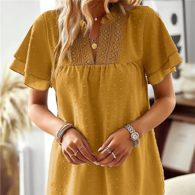 Casual V Neck Wave Hem Short Sleeve Shirt