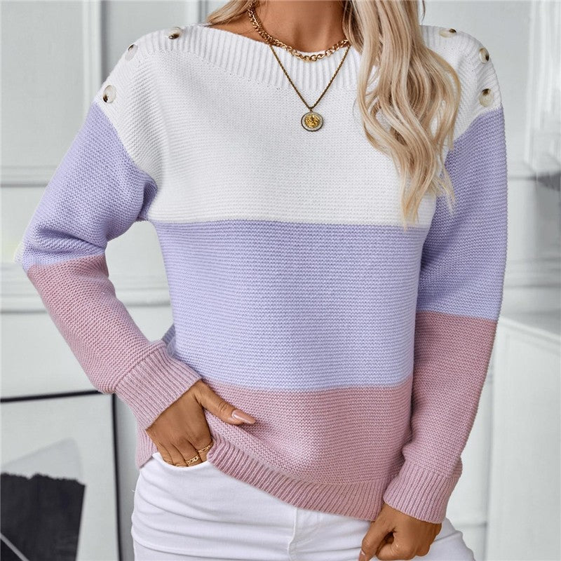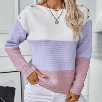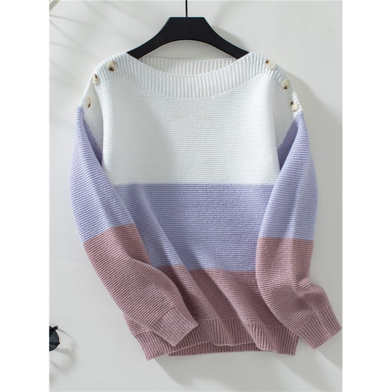 Discover our Contrast Color Crewneck Button Knit Sweater, a retro pullover with color-block design and boat neck. Made from polyester and Dacron, this loose-fitting long sleeve sweater offers light maturity for autumn. Perfect for going out or casual wear, it's a must-have in your knitwear collection.
