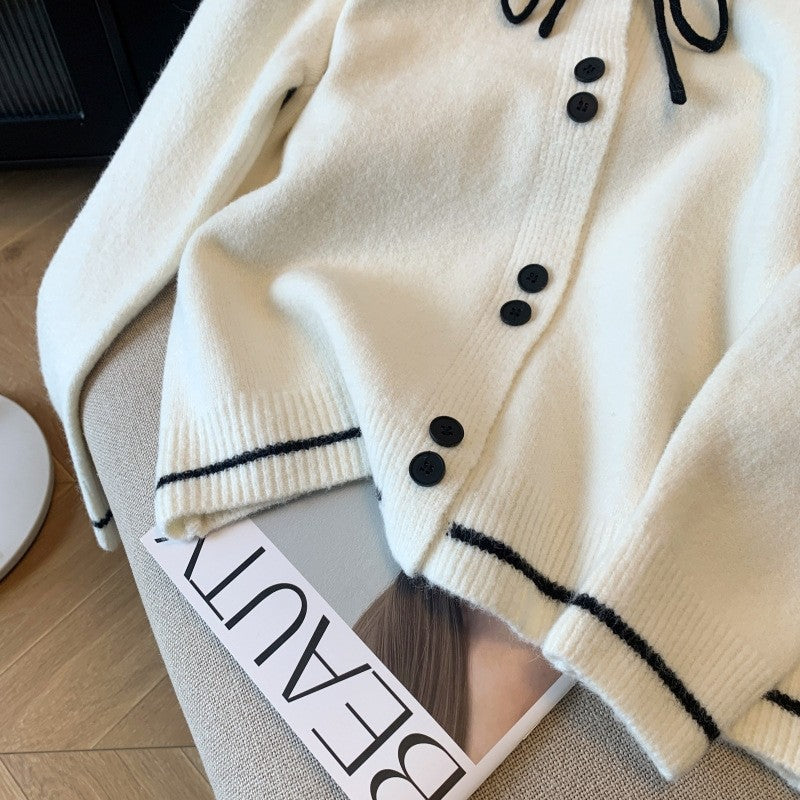 Contrast Color Long Sleeve Crewneck Single Breasted Tied Knitted Cardigan Sweater