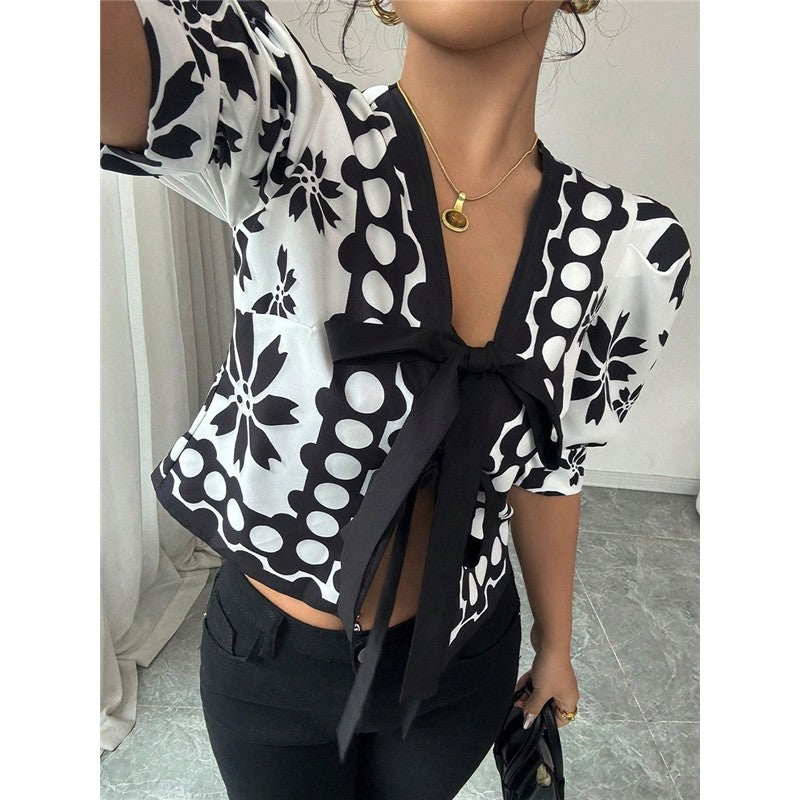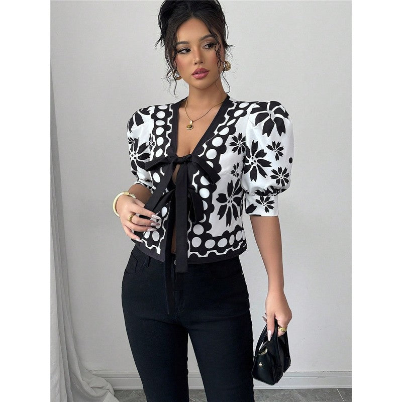 Discover our French floral sleeve blouse for women, featuring Dacron fabric, deep V-neck, and trendy balloon sleeves. Perfect for casual wear, summer vacations, or sexy party outfits. Shop this stylish short sleeve top now!