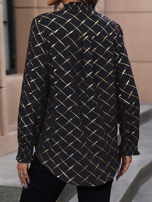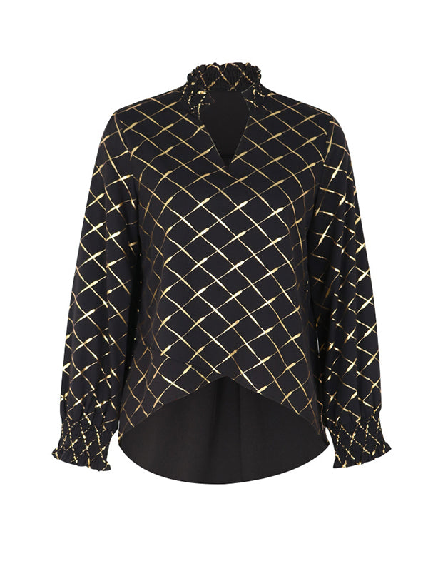 High-Low Wrap Bronzing Contrast Color High-Neck Blouses&Shirts Tops