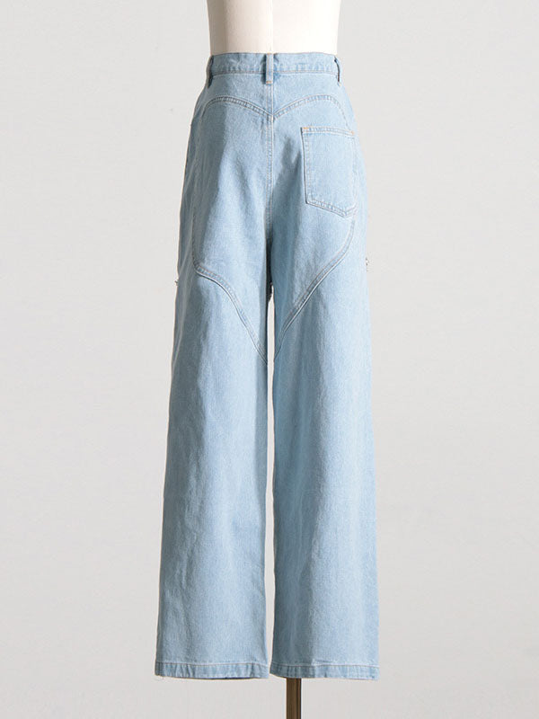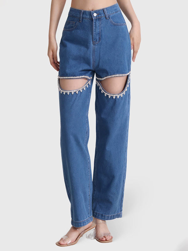 High Waisted Loose Hollow Rhine Stones Jean Pants Bottoms