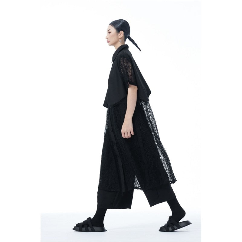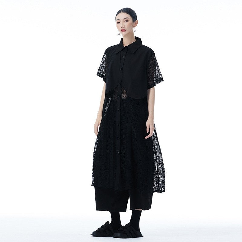 Discover our lace short sleeve shirt dress, a loose and breathable cotton-polyester blend perfect for summer. This normcore paneled design offers a stylish see-through lace polo look, ideal for casual outings or leisure fashion. Shop this original statement piece from our blouses & shirts collection.