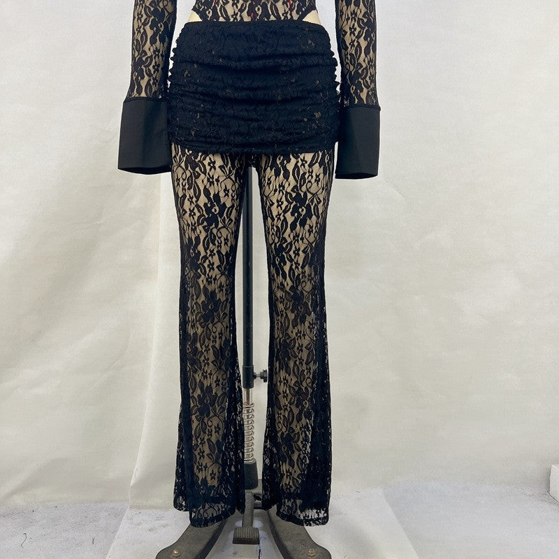 Lace Splice Deep V-Neck Long Sleeve Top And Flare Pants Set