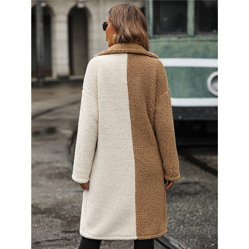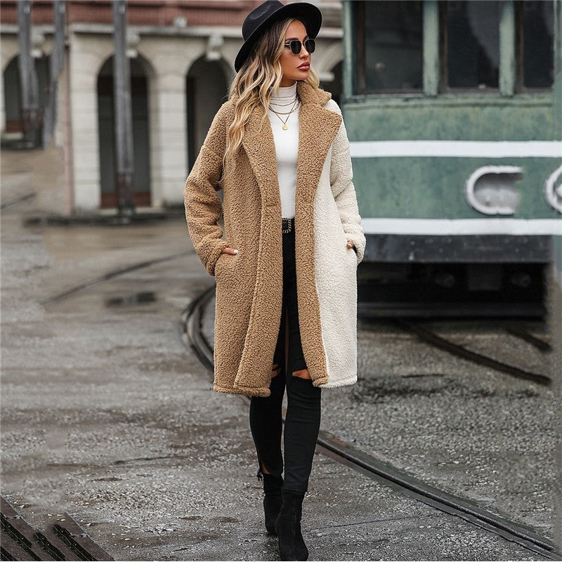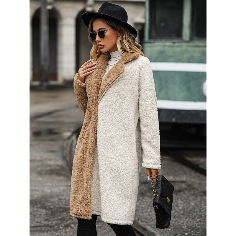 Long Sleeve Contrast Color Suit Collar Puff Velvet Long Coat