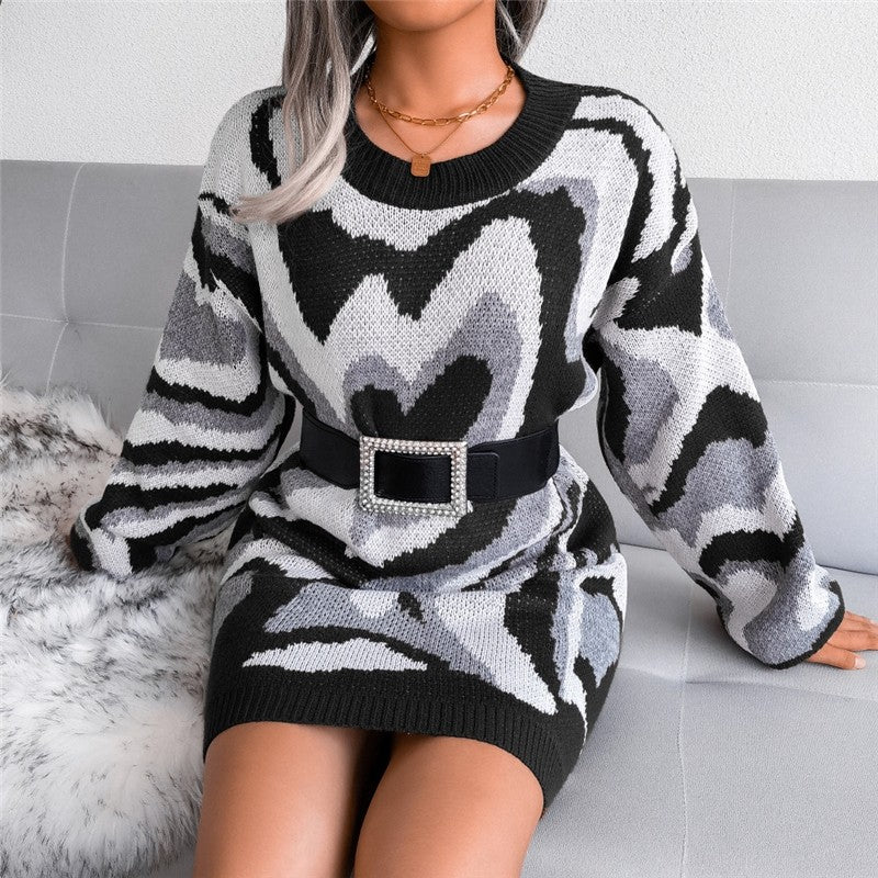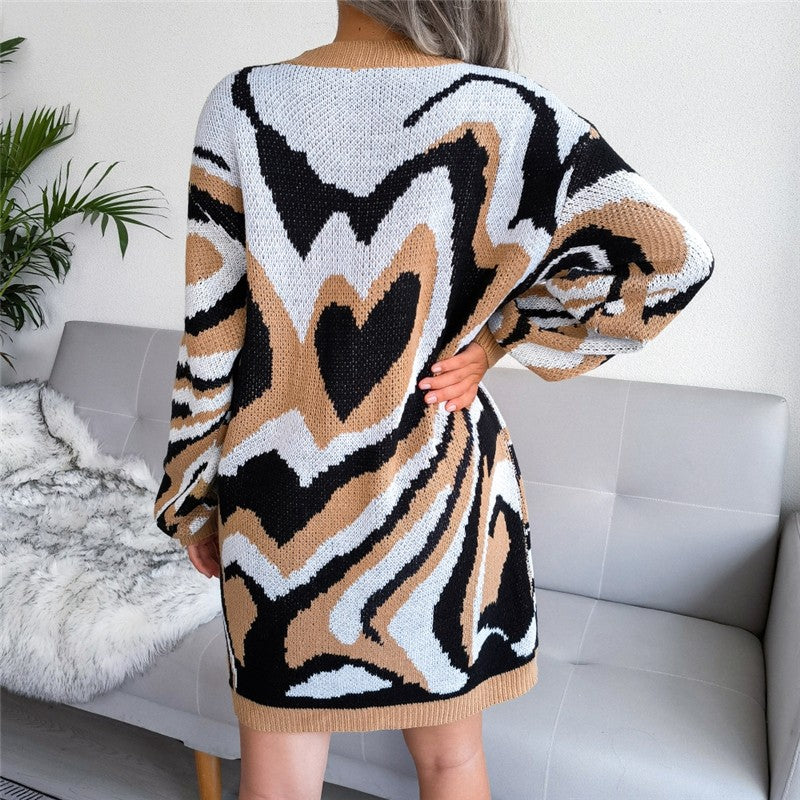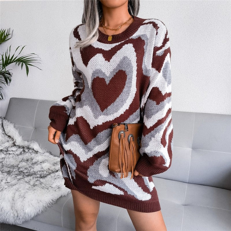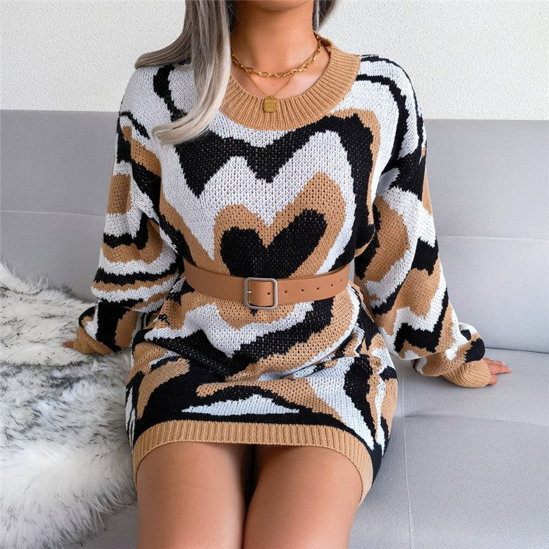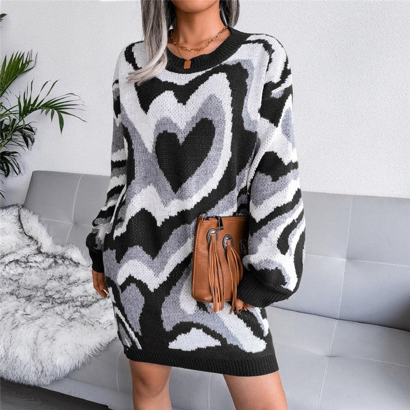 Long Sleeve Round Neck Contrast Heart Dress