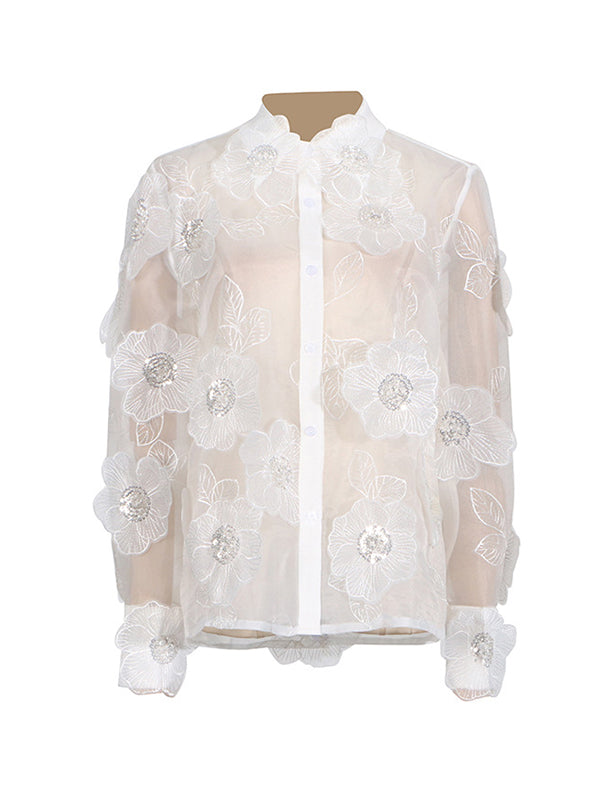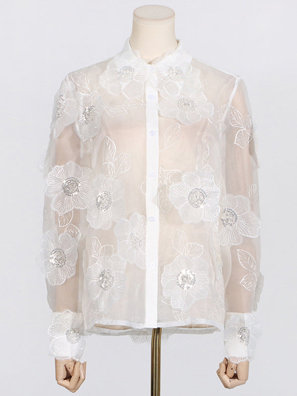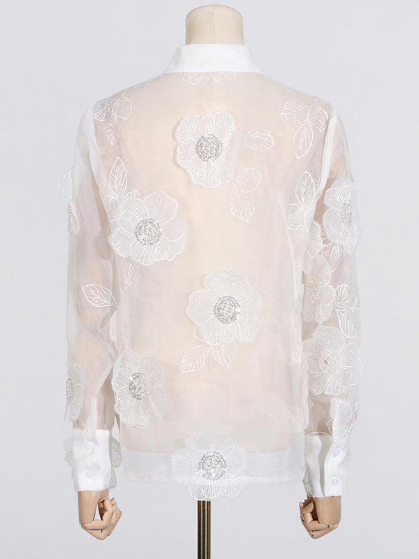 Long Sleeves Loose Buttoned Embroidered See-Through Three-Dimensional Flower Lapel Blouses&Shirts Tops