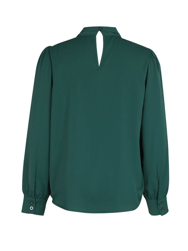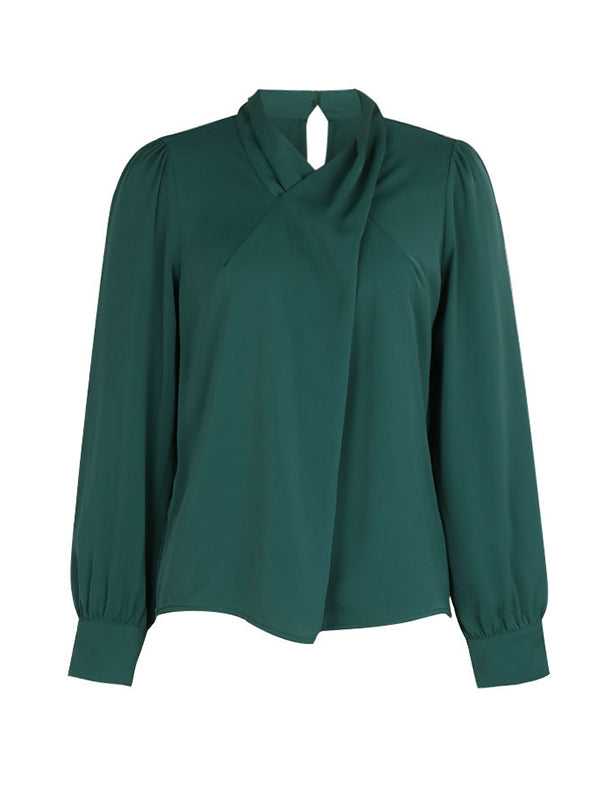 Long Sleeves Loose Buttoned Hollow Knot Pleated Solid Color V-Neck Blouses&Shirts Tops