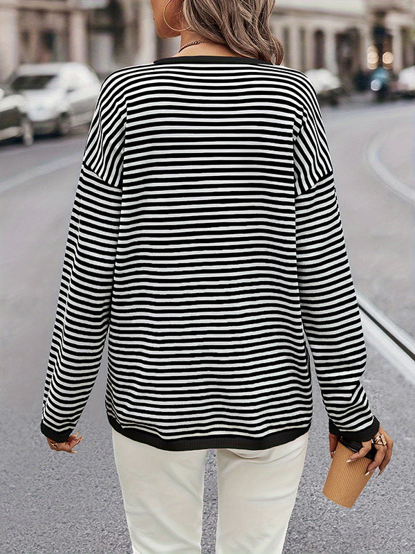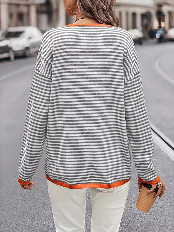 Long Sleeves Loose Contrast Color Split-Joint Striped Round-Neck Pullovers Sweater Tops