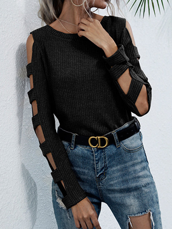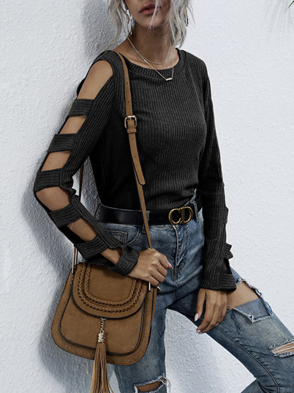 Long Sleeves Loose Hollow Solid Color Round-Neck T-Shirts Tops
