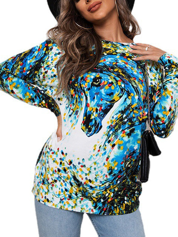 Long Sleeves Loose Printed Round-Neck Knitwear Pullovers Sweater Tops