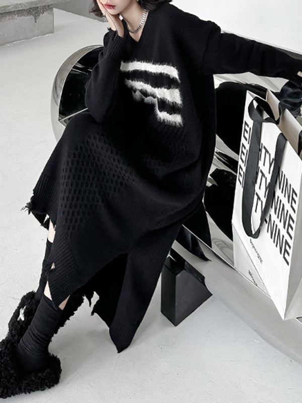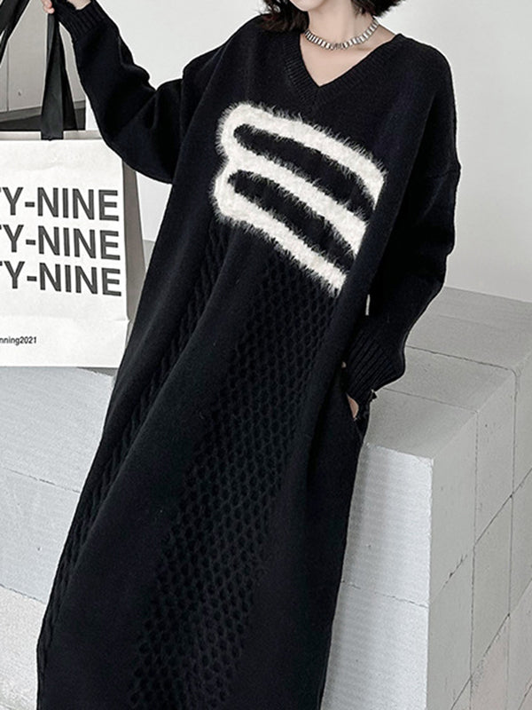 Long Sleeves Loose Split-Joint Split-Side V-Neck Midi Dresses Sweater Dresses