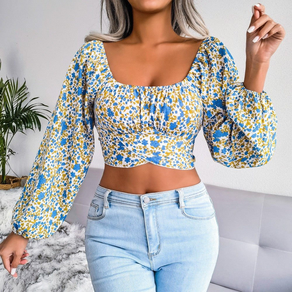 Print Puff Skeeve Bowknot Square Neck Chiffon T-Shirt