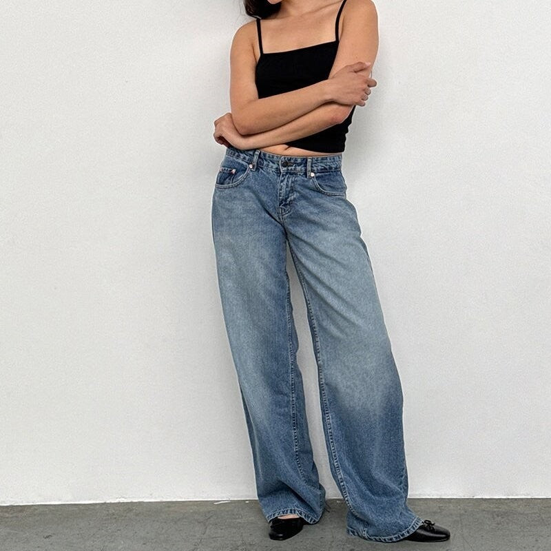 #Retro jeans, #straight leg, #low waist, #non-stretch, #water washed, #denim, #loose fit, #casual wear, #vintage style, #artistic retro
