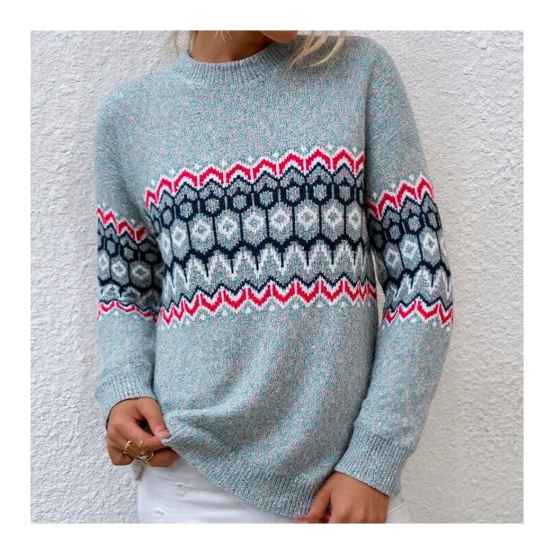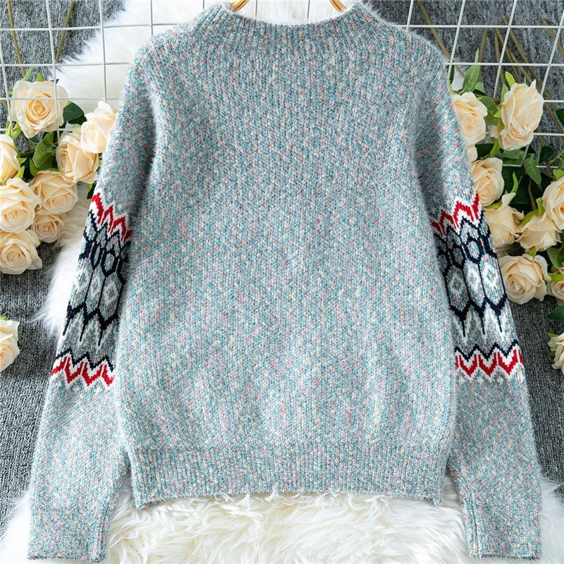 Semi High Neck Long Sleeve Jacquard Sweater
