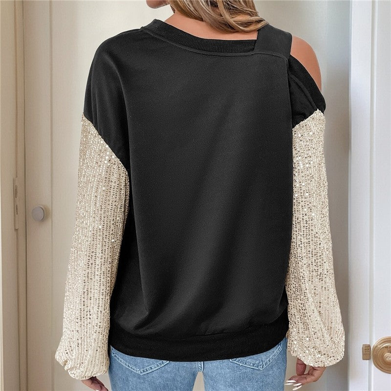 Sequined Cold Shoulder Color Block Sweatshirt